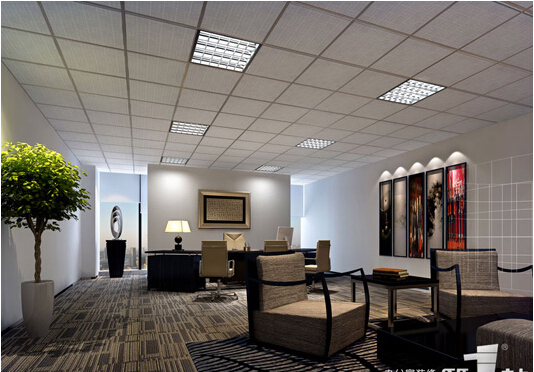 由圖可以看出,代表古國文明的長條裝飾畫,我們還可以在它的會議區的裝修上領略到中華書法的獨特魅力,層次感強的超級辦公裝修,形成一個多元化。