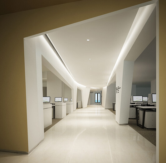 如圖所示,各個角落的設計搭配它們之間的空隙就像信息流通的告訴通道,這才是一個互聯網行業辦公室設計的最重要特點。這里的天花造型和前身的外觀是由大小不同的造型塊組合而成,川流不息,把企業的行業特征通過設計表現出來。